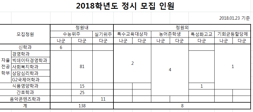 2018학년도 정시 신입생 모집인원 안내입니다. 2018학년도 수시 미충원인원으로 인해 정시 모집인원에 변동사항이 있어 공지합니다.