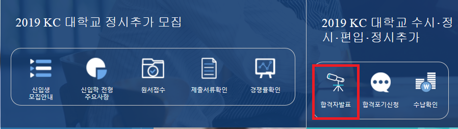 합격자확인은 본교 입시홈페이지 [합격자 발표] 아이콘을 클릭하여 확인 바랍니다.